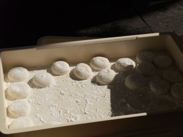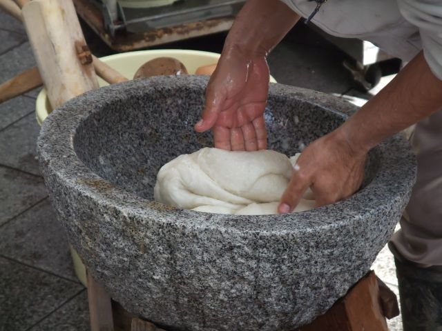 つきたての餅をそこで切って丸めてすぐに売るので