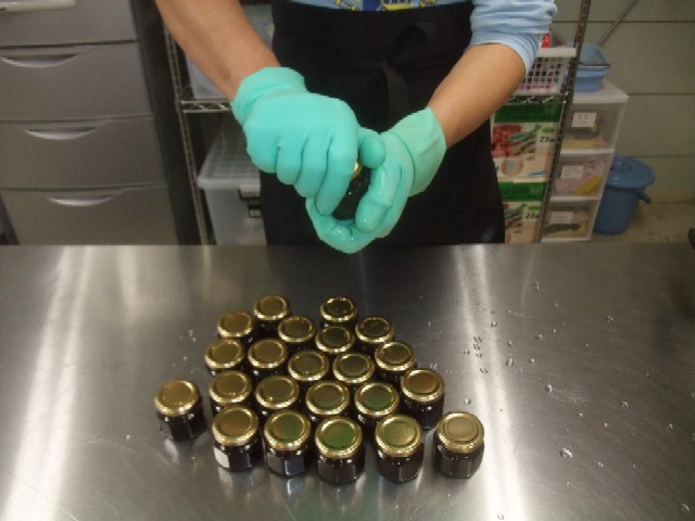 びんを煮沸したあと、できあがったピオーネジャムを詰めて
