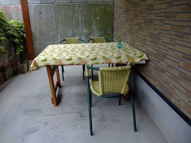 このテーブルもじつは、自分で作ったとのこと・・・テーブルクロスも