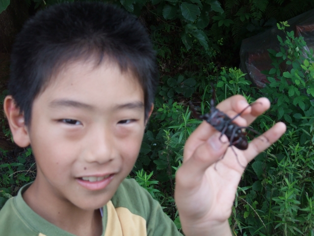 すかさずバタバタしているクワガタをひろって嬉しそう。