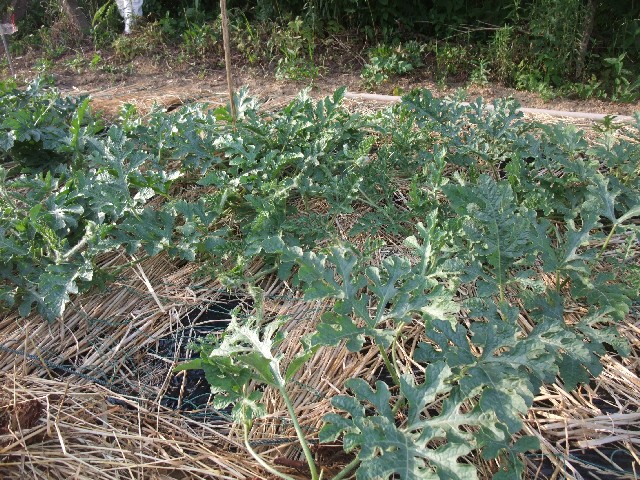 よーっく見るともう実がついています・・・でも、スイカの葉っぱって
