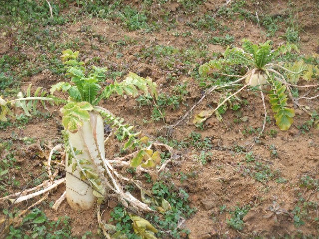 わが家の畑に行くと、もういよいよ最後の大根たちがチラリと