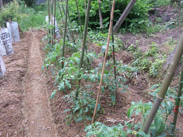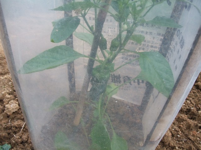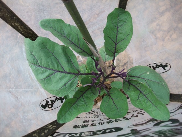 ナス。周りを虫よけのビニールで囲ってあるので上から