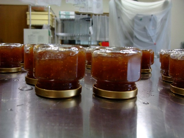 すでに煮沸したビンに煮詰めたいちじくジャムを詰めて、そのあと