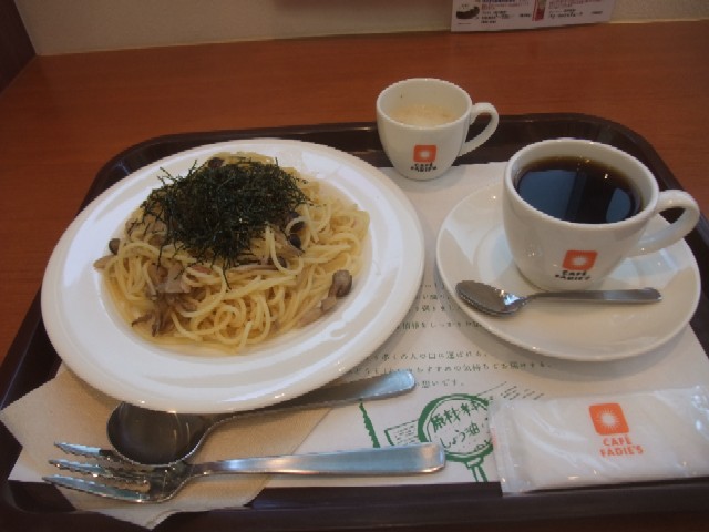 サラダ、トマトパスタ、デザート、コーヒーで800円。