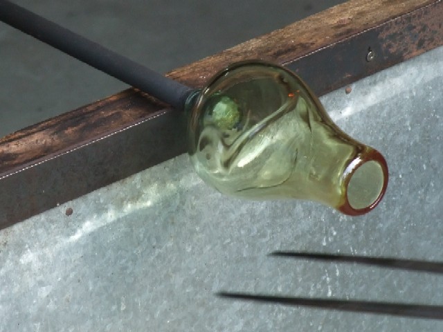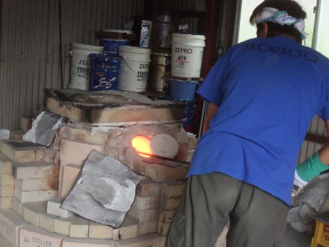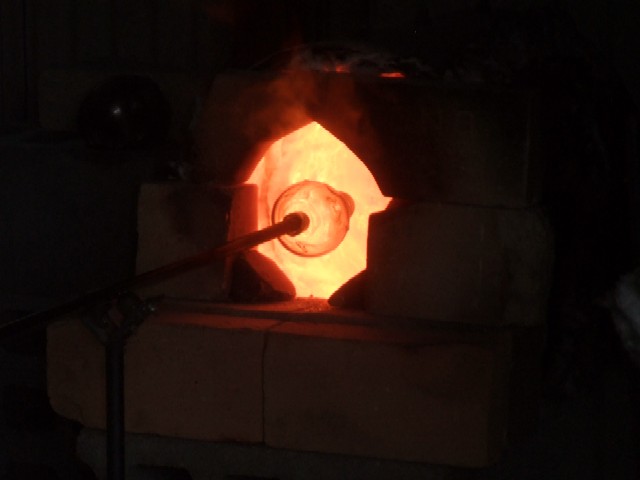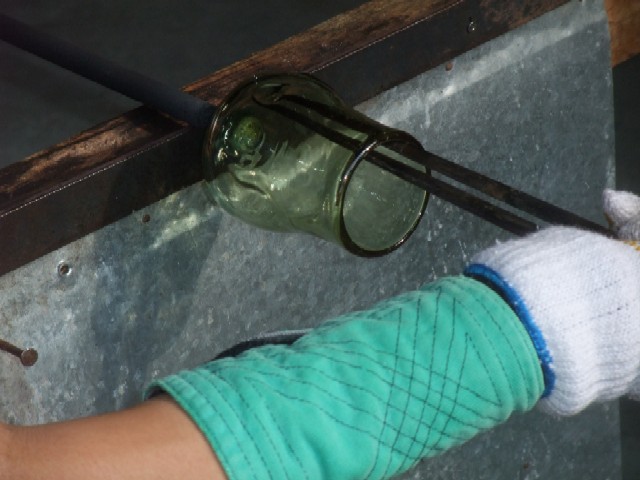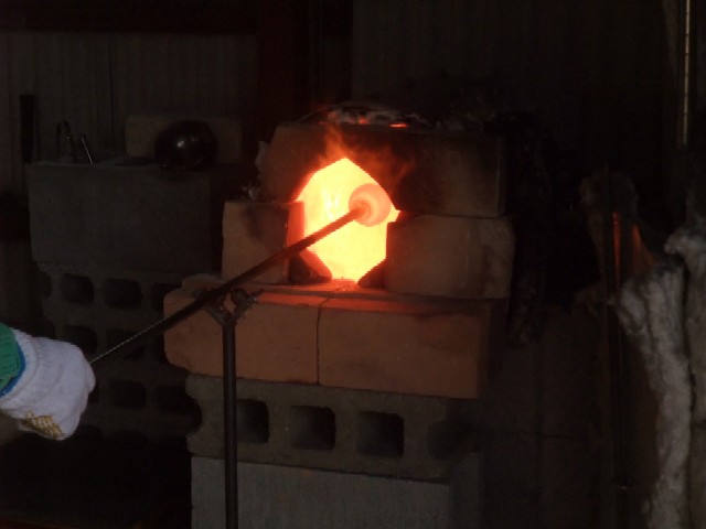 再度窯へ入れて少し溶かしては、出して形を整えていきます。