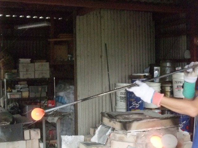 ガラスが溶けている窯からガラスを出します。
