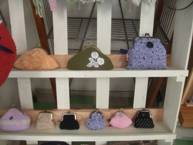 手編みのガマ口サイフやペットボトルホルダーなど。