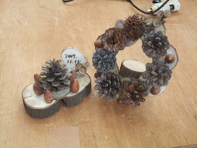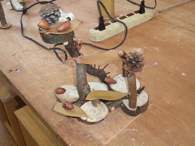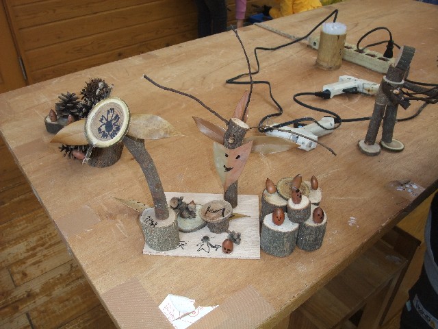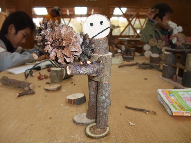 材料は、木のきれっぱしやドングリ、まっぼっくりなどなど