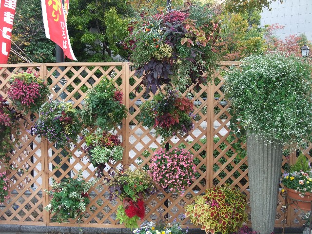華やかで美しい花々をハンキングバスケットで展示しています。