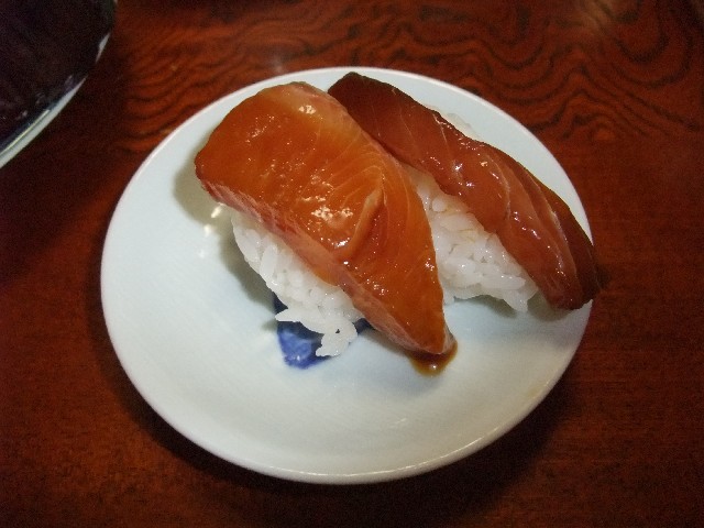 醤油をつけて食べますが、昔は醤油漬けにしておいた刺身をシャリに