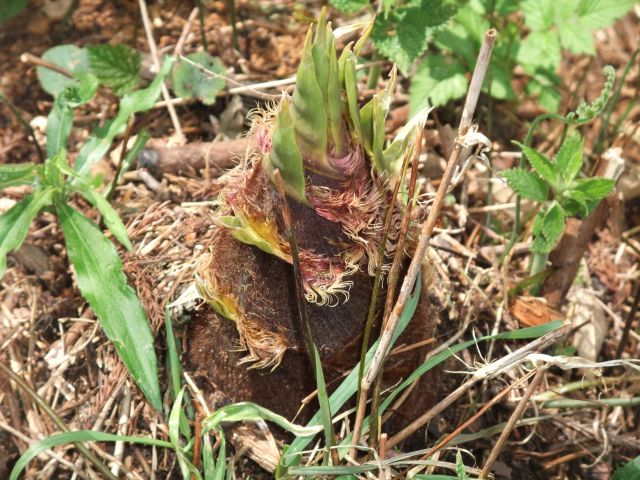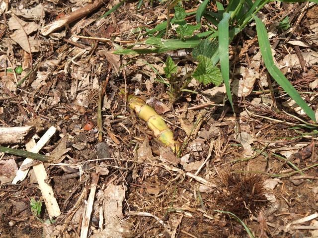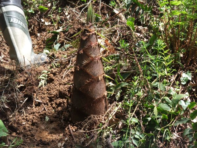 まず、たけのこの周りの土をよけてから、一つの位置を定めて