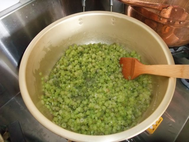 湯がいたふきを細かく刻んで砂糖で煮ます。