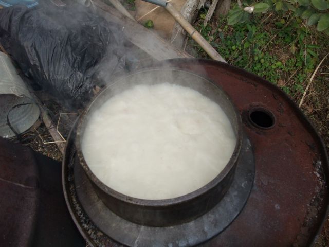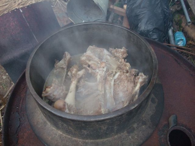 今回もシシを解体したあとの骨をこのカマに放り込んで