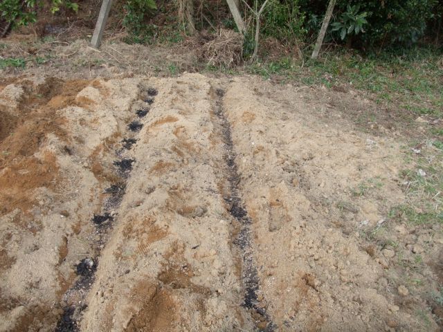 肥料(黒いもの)をまいて、上から土をかぶせます。