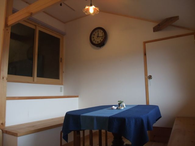 テーブルや椅子はもちろん手作りで、上にかけている