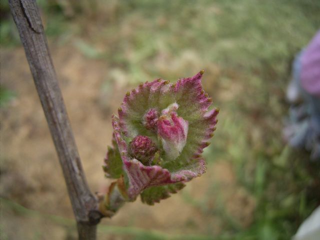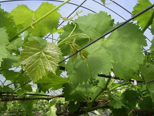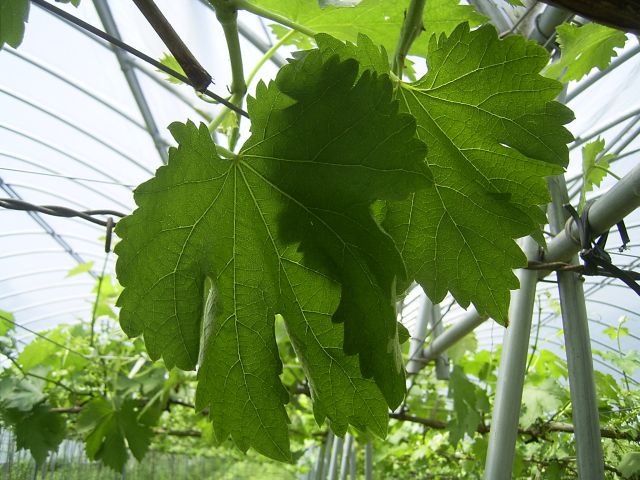 左の画像の小さな葉は翠峰、となりが巨峰。そして、真中の画像はピオーネの葉です。