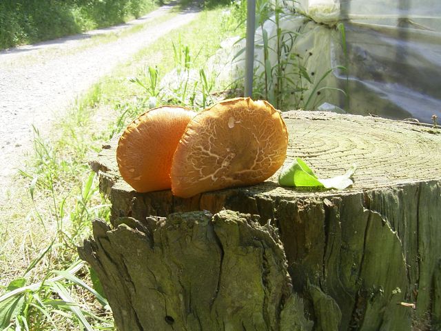 なんとキノコではないですか・・・下の大きな木の切り株は中に入ってきた車がハウスに当らないよう