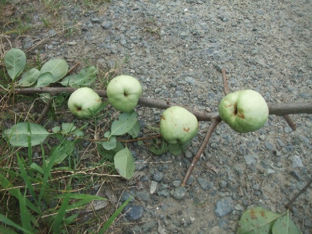 春先に咲く赤いきれいなボケの花が今、実になったわけです。